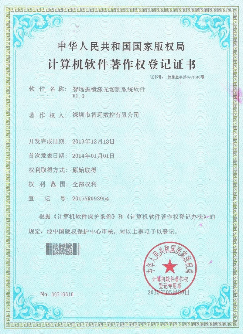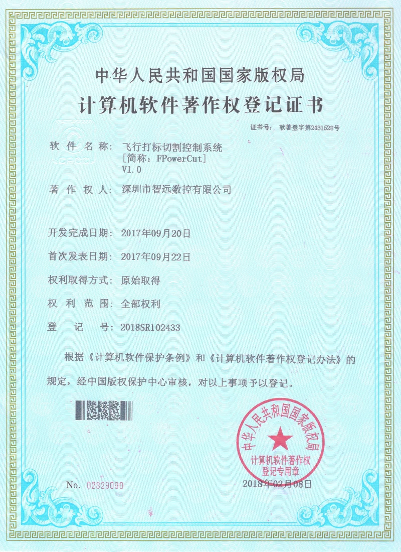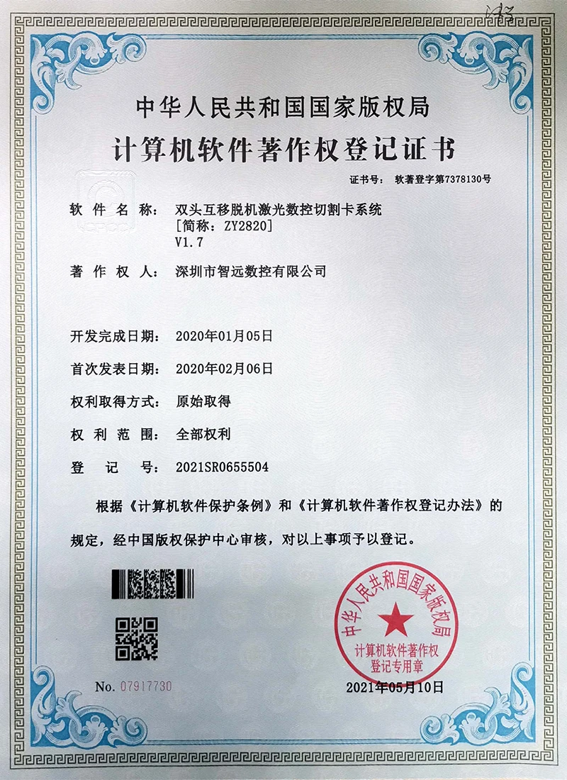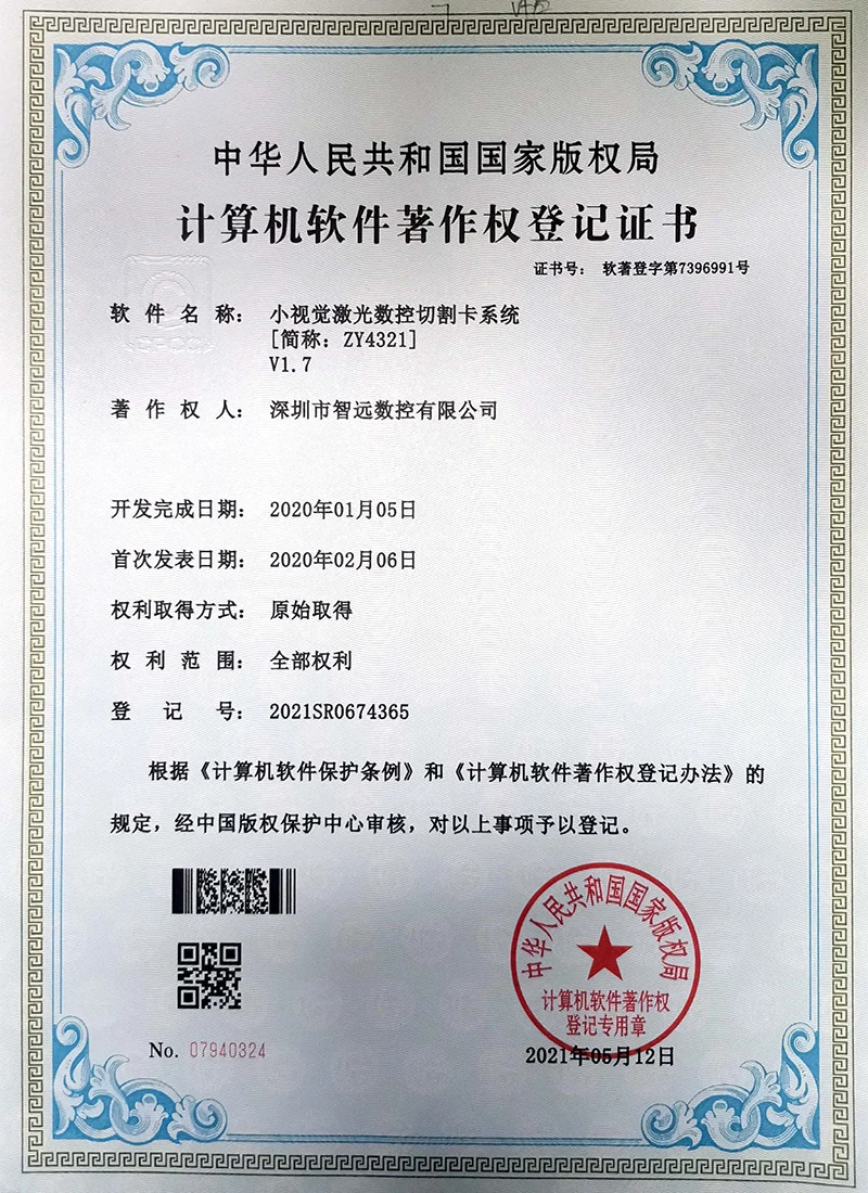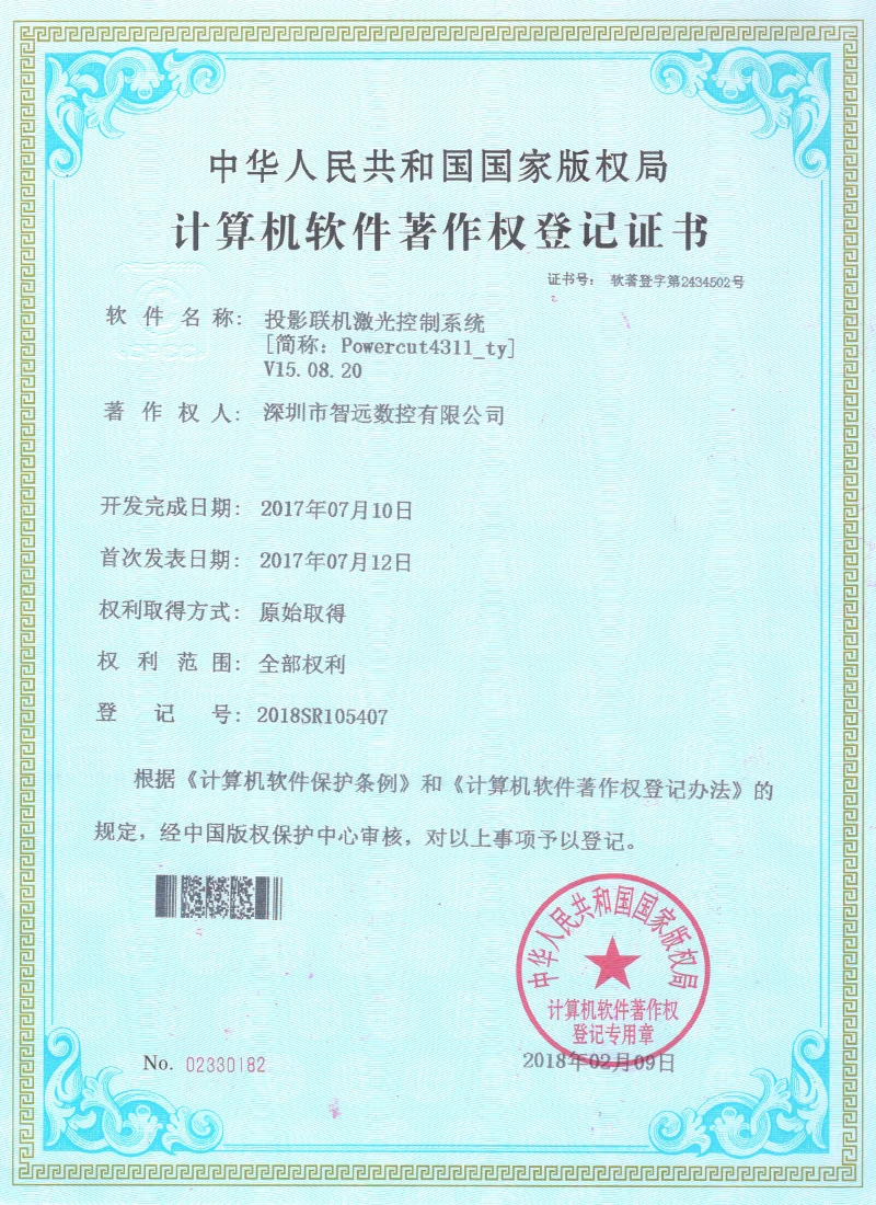 Vetítés online lézeres vezérlő rendszer; MARK point vision online laser control software; Galvanométer kettős repülés offline vezérlőrendszer; Vibrációs késvezérlő kártya rendszer v2; Kis látás online automatikus csavaros zárógép vezérlő kártya rendszer v12; Ablakpapír -géprendszer; Zhiyuan Galvanométer lézeres vágó rendszer szoftver; Kettős gerenda kölcsönös mozgásvezérlő rendszer; Shenzhen Zhiyuan CNC Visual Laser Cuting Control szoftver.